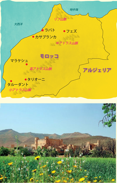 | モロッコにおけるサフラン生産の中心地で人口5千人のタリオーニ。古い砦が畑を見下ろすように立っている。 |