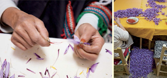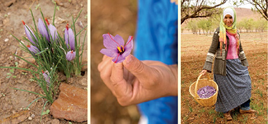 この期間、毎朝夜明け前になると、村の農民達が畑へ繰り出す。その大半が女性だ。花びらが開いて太陽の光に柱頭がさらされる前に、摘みとり作業を終えなければならない。サフランの柱頭は日光に当たるとしぼみ、色も香りも失ってしまうからだ。