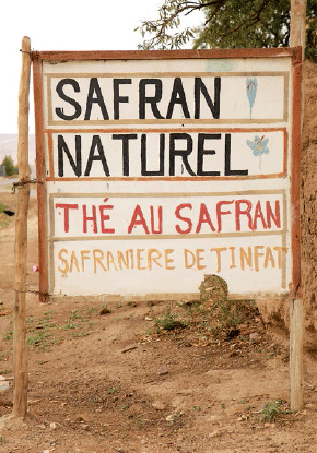 | タリオーニ近郊のサフランの看板。 この地域のサフラン農家の約9割が家族経営の小さな農家で、 35ほどある地元の協同組合がサフラン販売の大部分を手がけている。 |