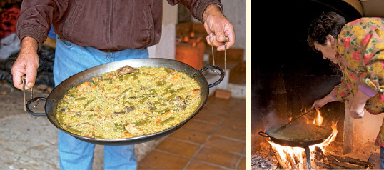 | サフランはスペインでも生産されている。地中海沿岸バレンシアの米料理パエリアにも昔から使われてきた材料だ。 右側の写真のように、直火でパエリアを調理する際には、鍋底で丁寧に米を炒める。サフランはこれに独特の香りを添えてくれる。 |