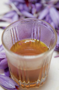 ポット1つ分(4人分)糸状のサフラン10本、この他に飾り用として各グラスにつき1、2本珠茶大さじ1砂糖大さじ2~3  耐熱性の茶瓶または小鍋に砕いたサフラン10本分と水720mlを入れ火にかける。 沸騰したら火を止め、1分間水で冷ましながらサフランが抽出されるのを待つ。 これに珠茶を加え弱火で5分間煮出す。 火から下ろし砂糖を加えて混ぜる。 茶瓶とグラスにお茶を交互に数回移し替えて混ぜる。 色は濃い黄金の飴色が理想的。 味を見ながら砂糖を加えて甘さを調節し、 こしながら透明なティーグラスに注ぐ。サフラン1、2本を飾り、熱いうちにいただく。 |