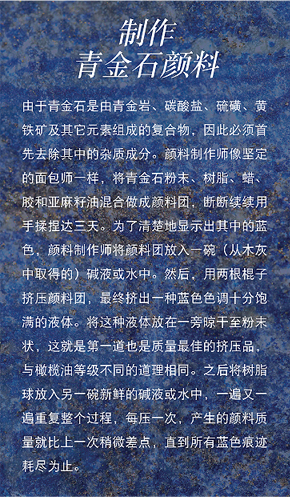 作这样比喻的人不只他一个。 青金石提高了三世纪佛教石窟至十四世纪俄罗斯东正教圣像、罗马天主教、拜占庭教堂和穆斯林手稿的宗教艺术。 据 13 世纪巴格达和摩苏尔的手稿记载,哈里发、作家和宫女均穿着青金岩色调的长袍。 从伊斯坦布尔和威尼斯到保加利亚、马其顿和加泰罗尼亚的教堂中,随处可见青金岩天空辉映的天堂画作。