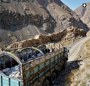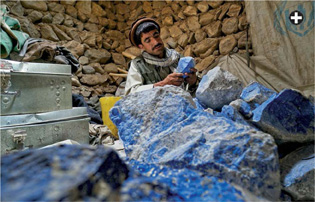 | 从上到下: 阿富汗政府和国际手工艺组织近来开始采取措施,改善在这个几乎不受任何监管的行业劳作的矿工们的状况。 哈米杜拉和自己的同行们在迈阿丹村对青金石进行分类和分级,然后把这些石头装入袋中,将它们装到卡车上,运给较大的批发商,批发商主要在白沙瓦,也有部分在中国。 |