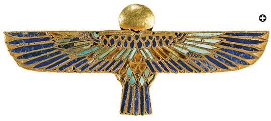 | 顶部图片: 在埃及,青金岩被奉为珍宝镶入这只被视为护身符的鸟的羽翼中,上图所示约为实际大小的三倍。 上图: 公元前 2600 年,苏美尔工匠开始切割从现今阿富汗沿商队路线带回来的青金石,用来制作乌尔王军旗的背景和花边,军旗中的镶嵌图是用贝壳切割而成的。 |