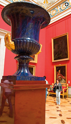 | 陈列在圣彼得堡埃尔米塔日博物馆的巴达赫尚花瓶精雕细琢,给人的感觉好像是用单块青金石雕刻而成,花瓶高 178 厘米(将近 6 英尺)。 |