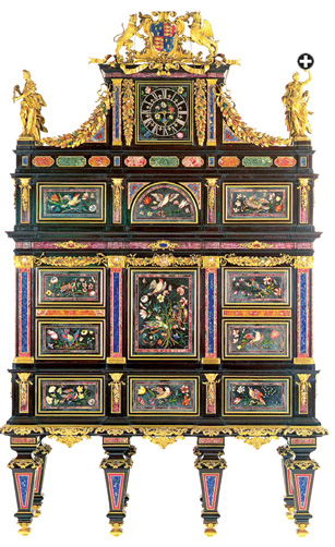 | 巴德明顿橱柜上雕工精细的青金石和其它次等宝石碎片比指甲上的月牙还要小,经过精心组合,别出心裁地刻画出鸟儿在花丛和彩带间翩翩起舞的场景。 高四米——近 13 英尺,这件橱柜是由 30 个工匠于 18 世纪在佛罗伦萨用超过六年的时间完成的。 |