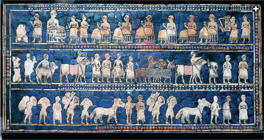 在一个被称作乌尔王军旗的华丽盒子的青金石背景上镶嵌着苏美尔国王、赴宴宾客和乐师的图像,这个华丽的盒子是公元前 2500 年美索不达米亚的重要宝藏的一部分。 在文学方面,苏美尔《吉尔伽美什史诗》曾提到过一架装有黄金和青金岩的战车。