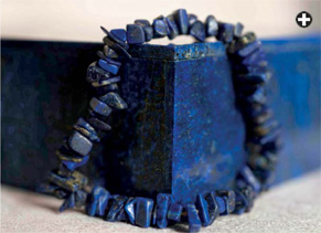 在许多地方的许多时期,古往今来的统治者和富人用青金石纪念物作为陪葬物来供奉来世神明是十分常见的现象。 青金石还因具有养身功效而倍受重视: 莫格比尔自己脖子上就带着粗糙的方珠,并坚称这有助于降低他的血压。 由于青金石的颜色仿佛清澈的理想蓝天,因此被普遍认为是终极天石,它采掘自黑色的土地,并可产生超然的灵感。