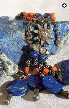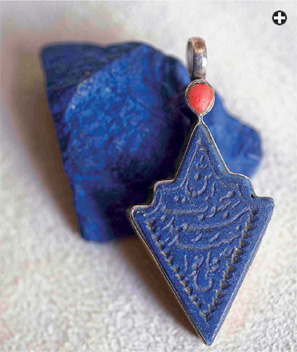 1973 年,希尔赖特在她的丈夫和两个孩子的陪同下来到阿富汗。 二月里一个寒风刺骨的晚上,她闯入喀布尔热闹非凡的主要集市,她回忆当时还曾与一位名叫作阿卜杜勒·马吉德的商人为一块三角形布满方解石斑点条纹的青金石讨价还价。 那是几十年来长途跋涉,从马里的沙漠商店到牛津的路边摊贩,为青金石讨价还价的开端。 至今她仍戴着那件搭配银链的首份战利品。