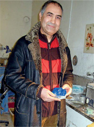 | 顶部图片: 莎拉·希尔赖特握着文章开头和印刷版封面中提到的阿沙德·可汗的宝珠。 她说,她对青金石的迷恋源于其少年时期读到的一首罗伯特·勃朗宁所作的诗歌,从此一生着迷于“一种可以震慑心魂的蓝”。 上图: 卡里尔·莫格比尔是 20 世纪 80 年代逃离苏联占领区,随后在德国伊达尔-奥伯施泰因定居的阿富汗珠宝商之一。 |
