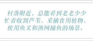日子就这样一天天过去。 我们嘎嚓嘎嚓地穿过芦苇床、芦苇丛、运河、泻湖和湖泊。 村落附近,总能看到老老少少忙着收割芦苇、采摘食用植物、使用鱼叉和渔网捕鱼的场景。
